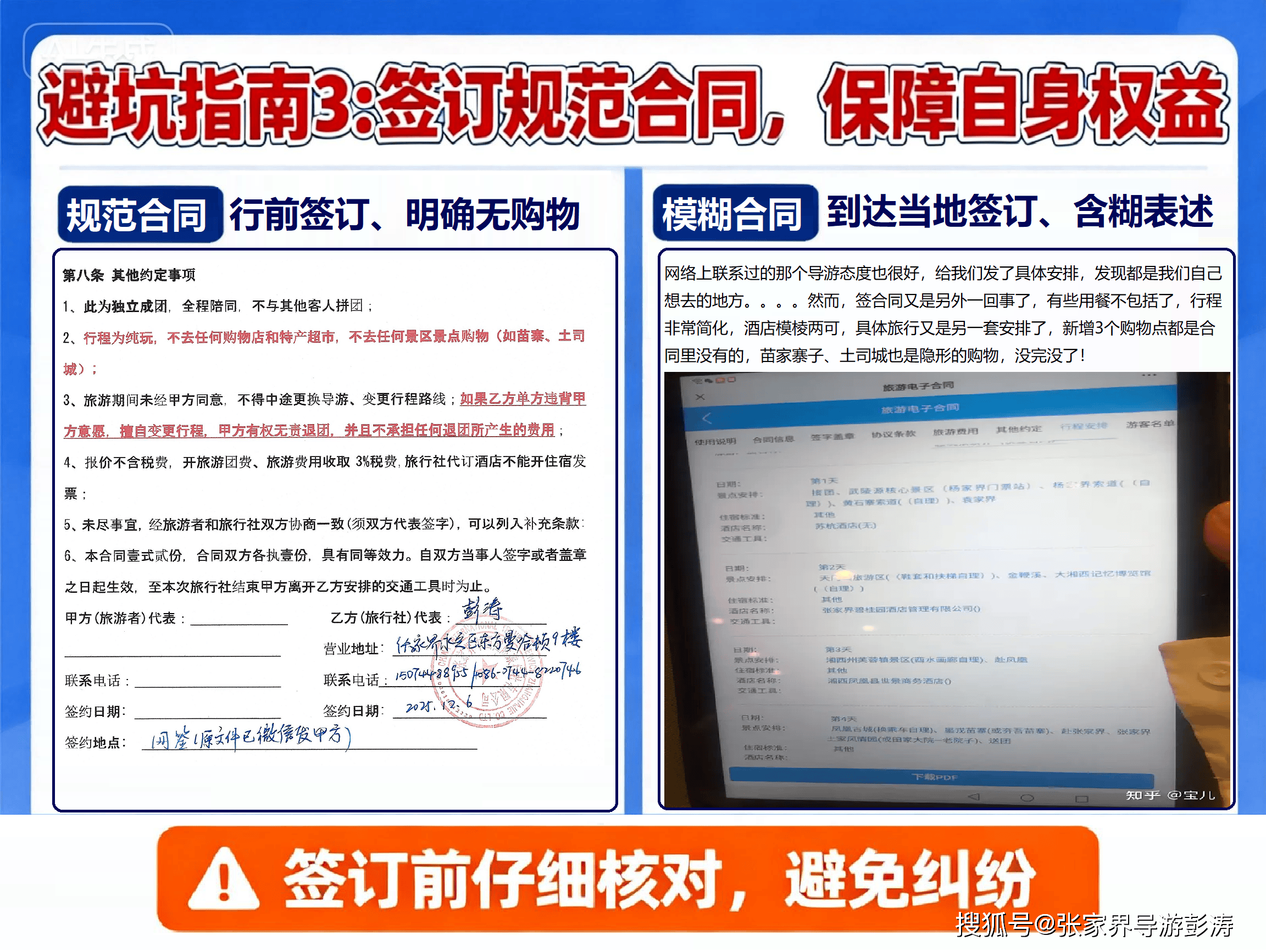 3. 提前签订合同,保障权益:出发前要与旅行社签正式旅游合同,着重注明两个关键要点。一是“无任何购物”,特别是无景区景点购物,从法律层面约束旅行社和导游;二是详细写明违约赔偿责任,如强制购物等违约行为需赔偿双倍团费,让旅行社和导游有所忌惮,保障旅行权益。