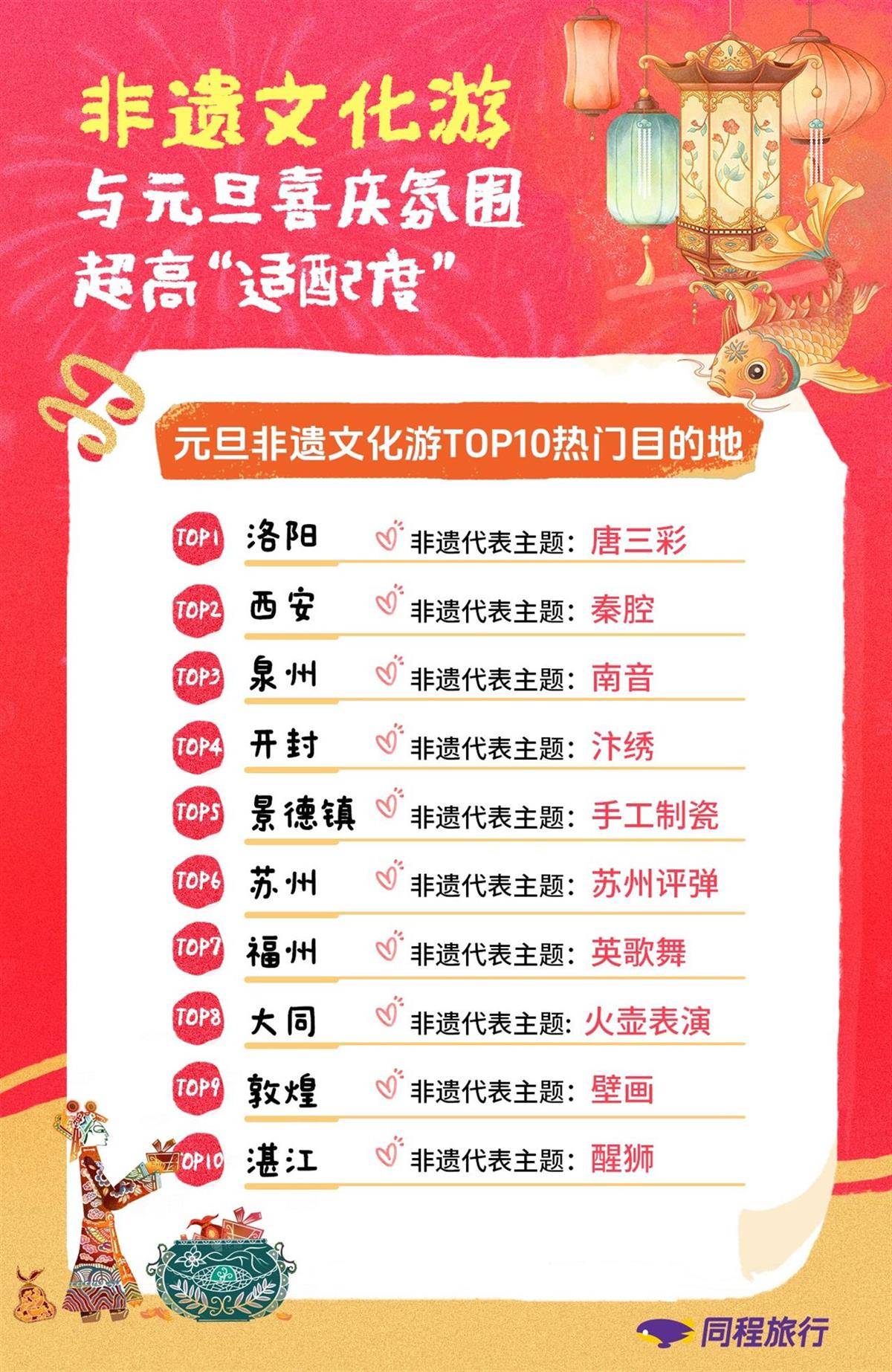 辞旧迎新之际,非遗文化游与热闹喜庆的元旦氛围适配度高。报告表明,元旦假期间,“非遗”主题旅游搜索及预订热度环比增长85%,洛阳、西安、泉州、开封、景德镇、苏州、福州、大同、敦煌、湛江等城市位居非遗文化目的地榜单TOP10。