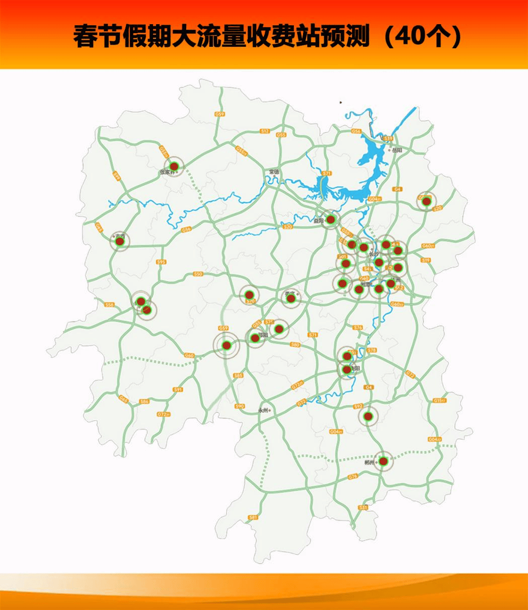 40个重点收费站:长沙西、长沙、学士、雨花、黄花、㮾梨东、石鼓、金桥、邵阳南、株洲、白竹、星沙、湘潭北、邵东、黄花塘、洞井、九华、新化、永安、郴州、坪塘、株洲西、三一、捞刀河、南岳、湘乡、望城经开区、耒阳、万家丽南、怀化北、怀化南、新港、益阳、雁峰、凤凰、长龙、平江、张家界、隆回、大托。